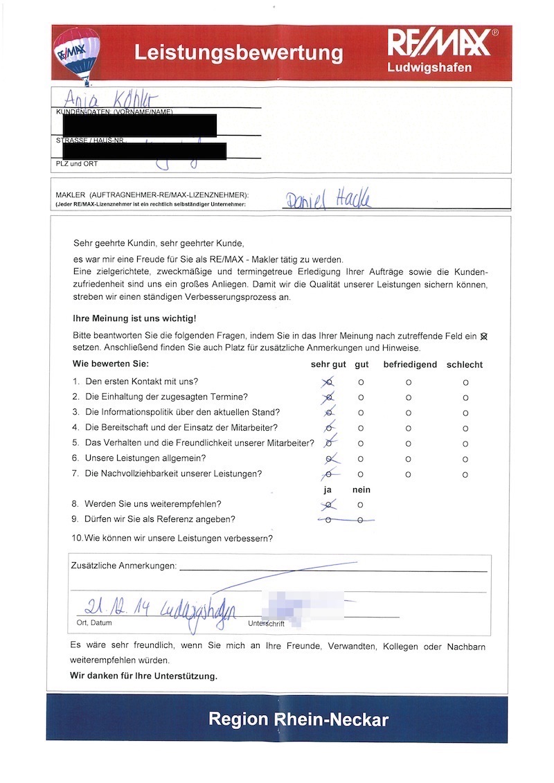 Ein Kunde aus Altrip (aus Datenschutzgründen anonymisiert)